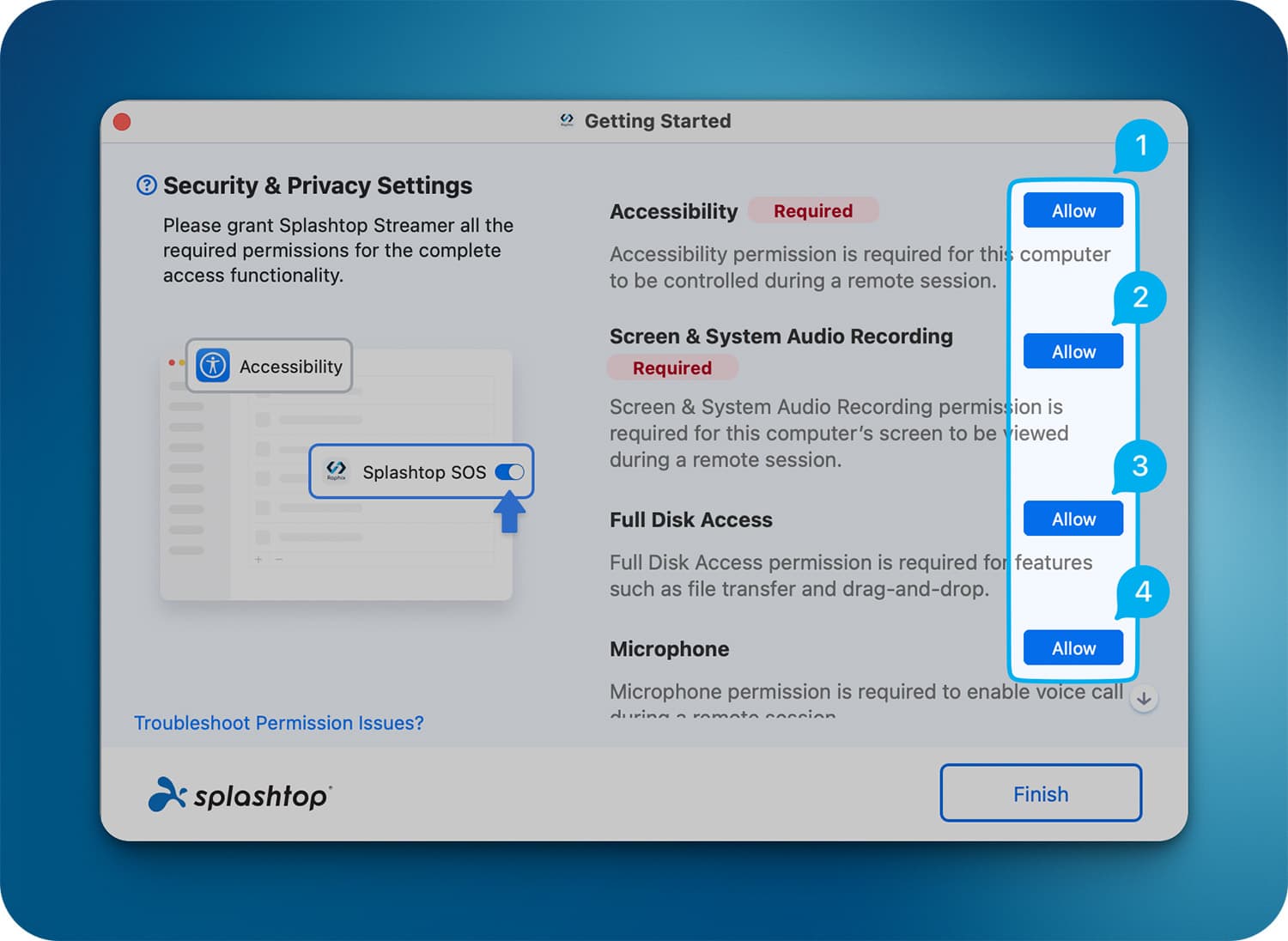 macOS öffnet bei jedem Klick auf Allow die System Settings (Systemeinstellungen). Für jede der vier Berechtigungen: