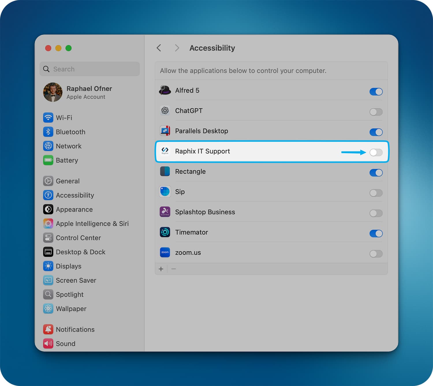 - Suche in der Liste Raphix IT Support und aktiviere den Schalter.