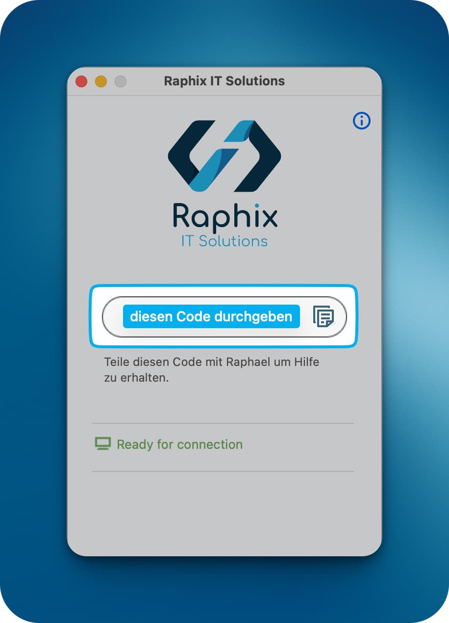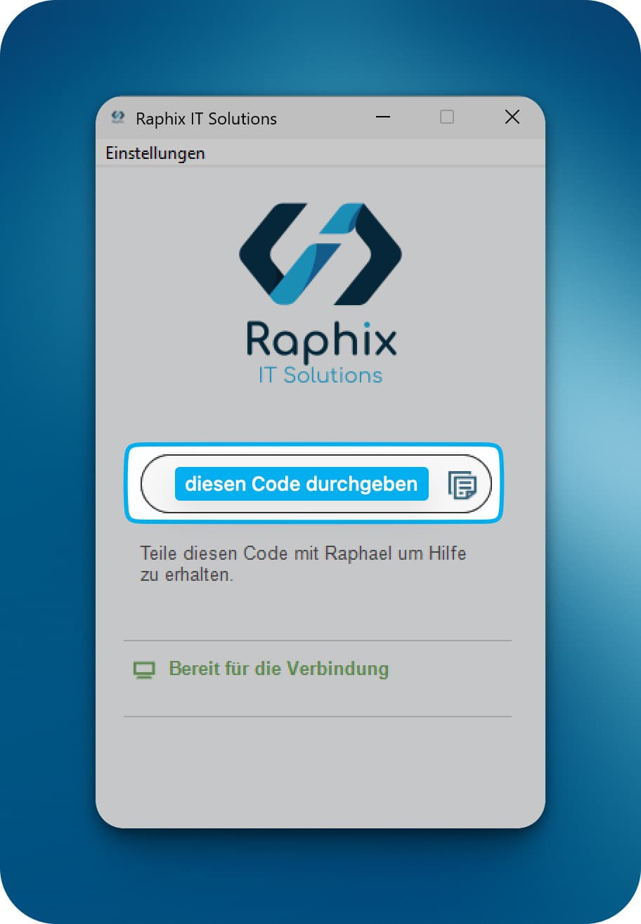 Nach den erteilten Freigaben wechsle bitte erneut zum Support Fenster mit dem Raphix Logo. In der Mitte steht ein Sitzungscode, den du mir bitte telefonisch oder per Messenger durchgeben musst.